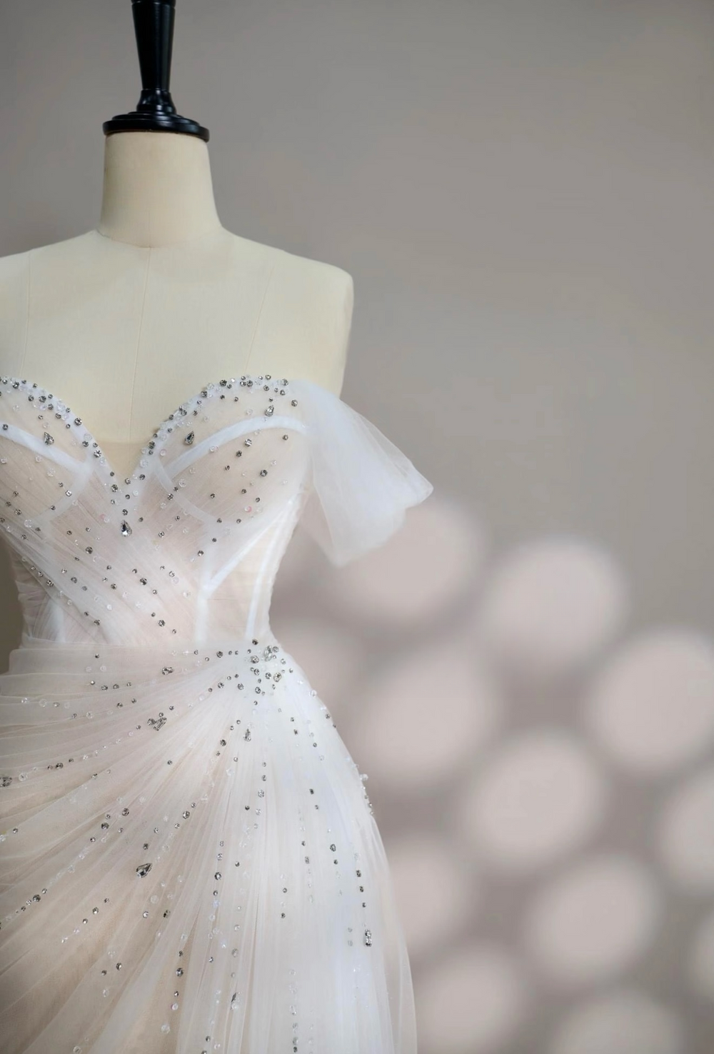 Champagne Pink Off Shoulder Tulle Lace Long Prom Dress, Champagne Formal Dress