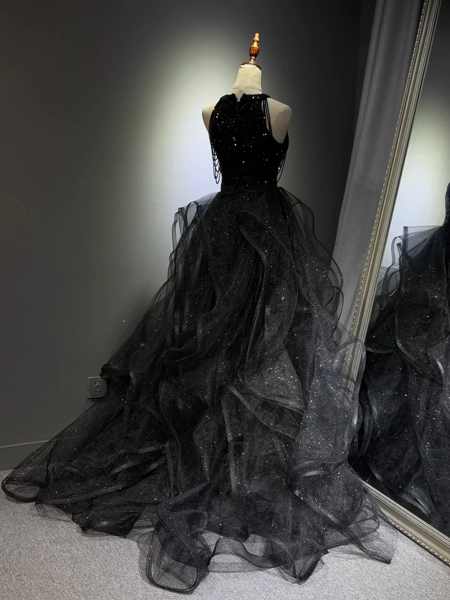 A-Line High Neck Tulle Ball Gown Sequin Black Prom Dress with Beads