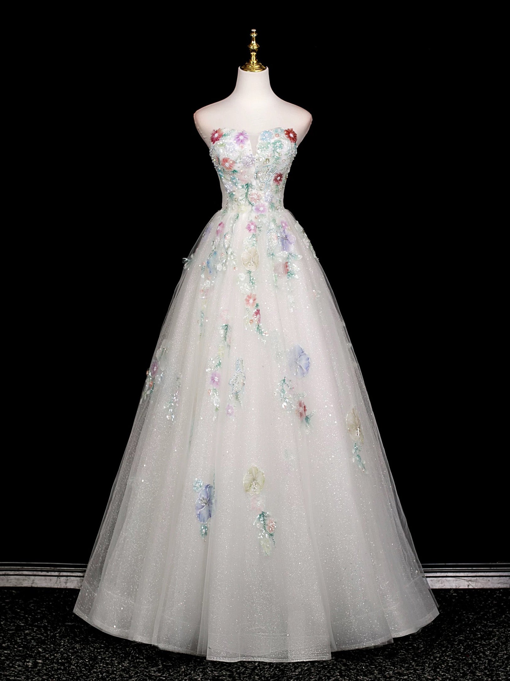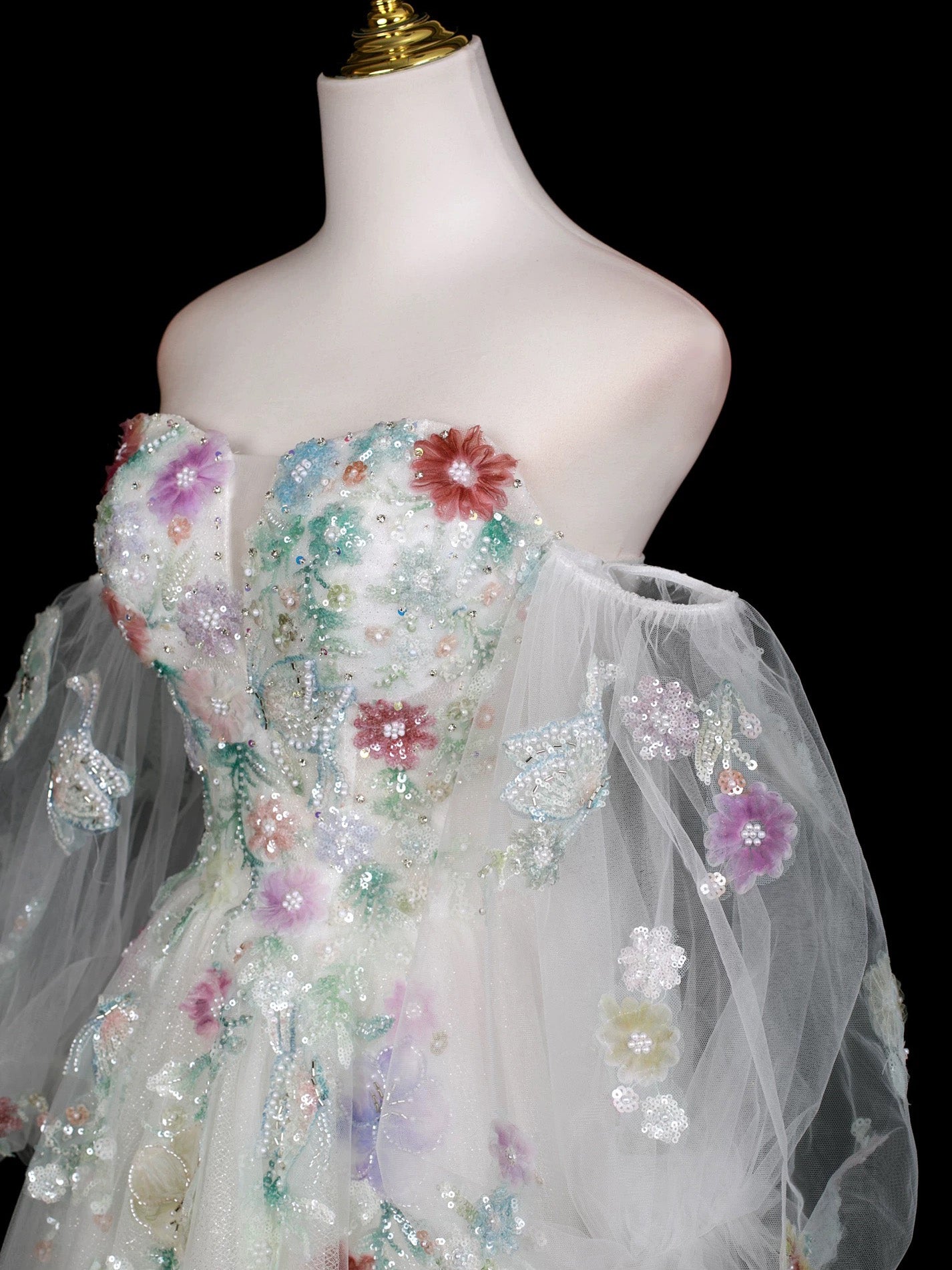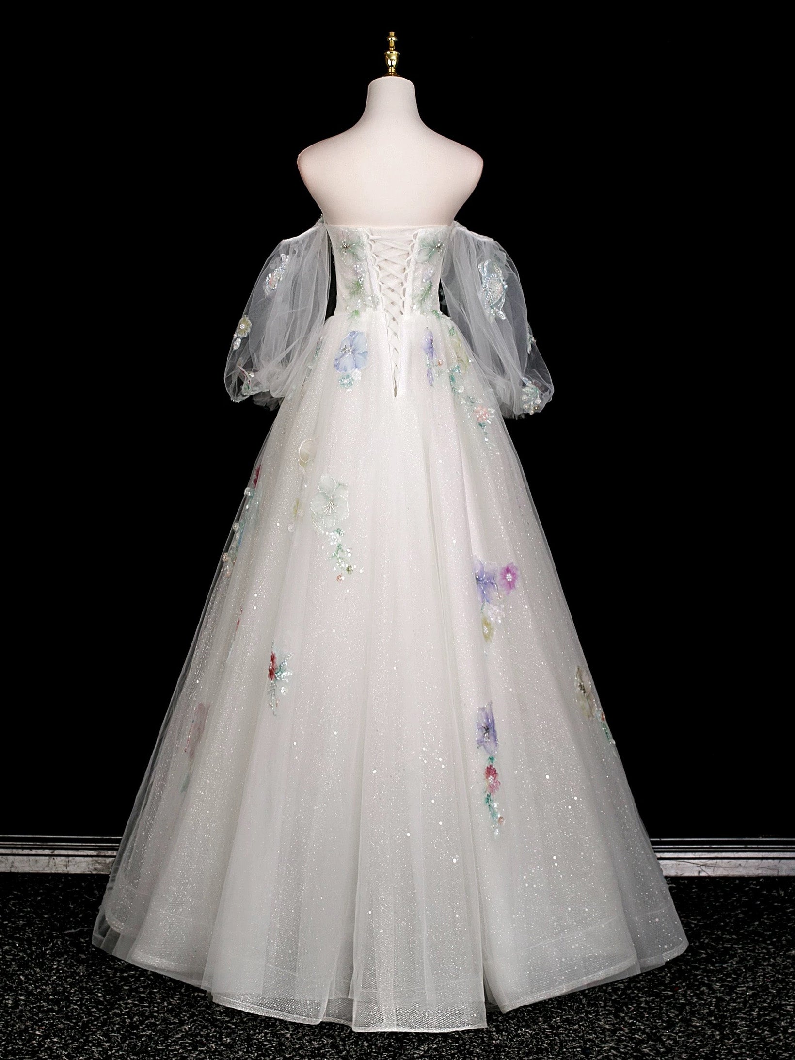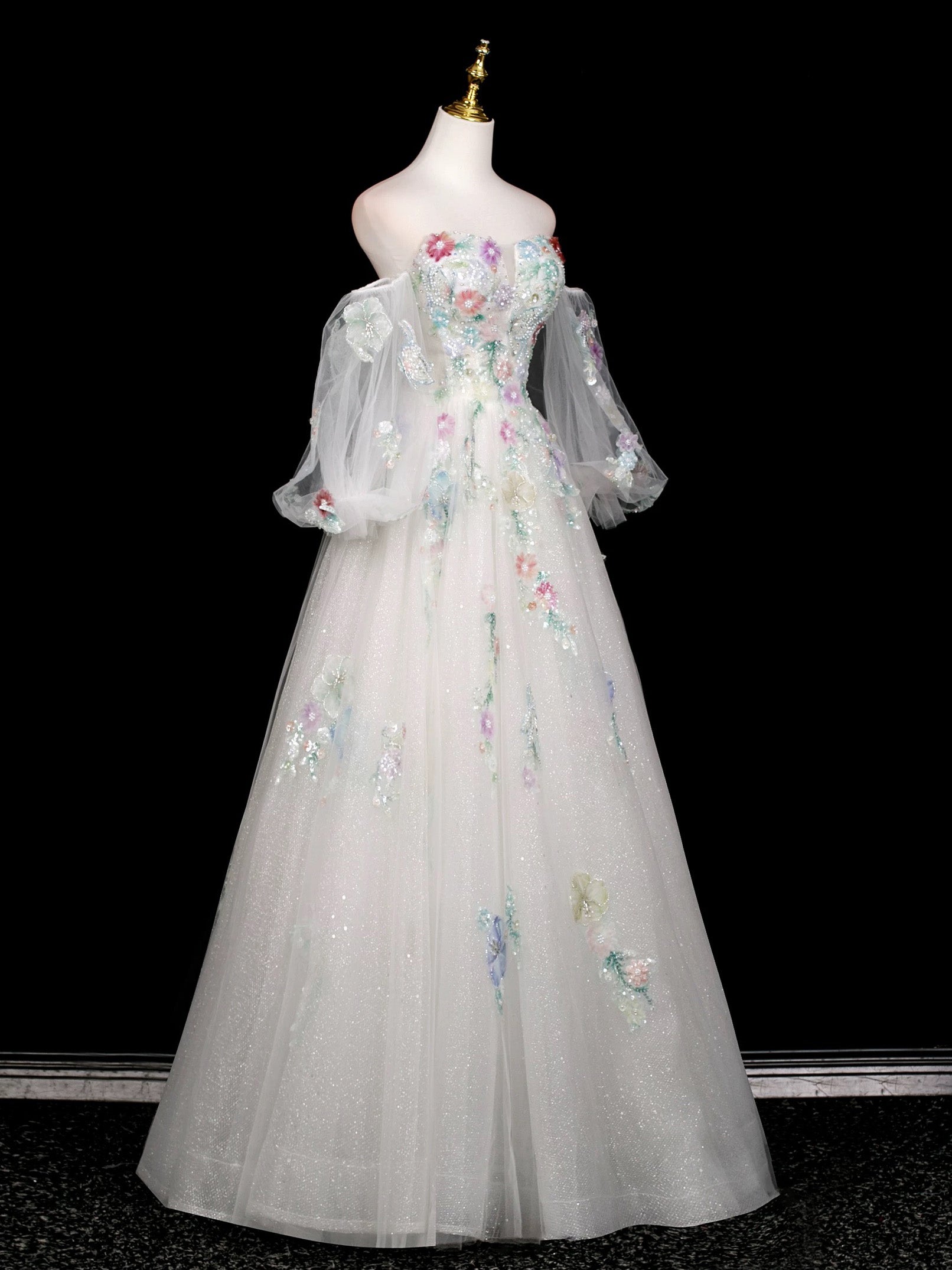A-Line Long Sleeves Tulle White Long Prom Dress, White Long Graduation Dress